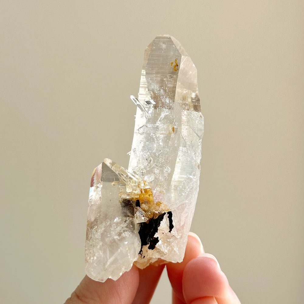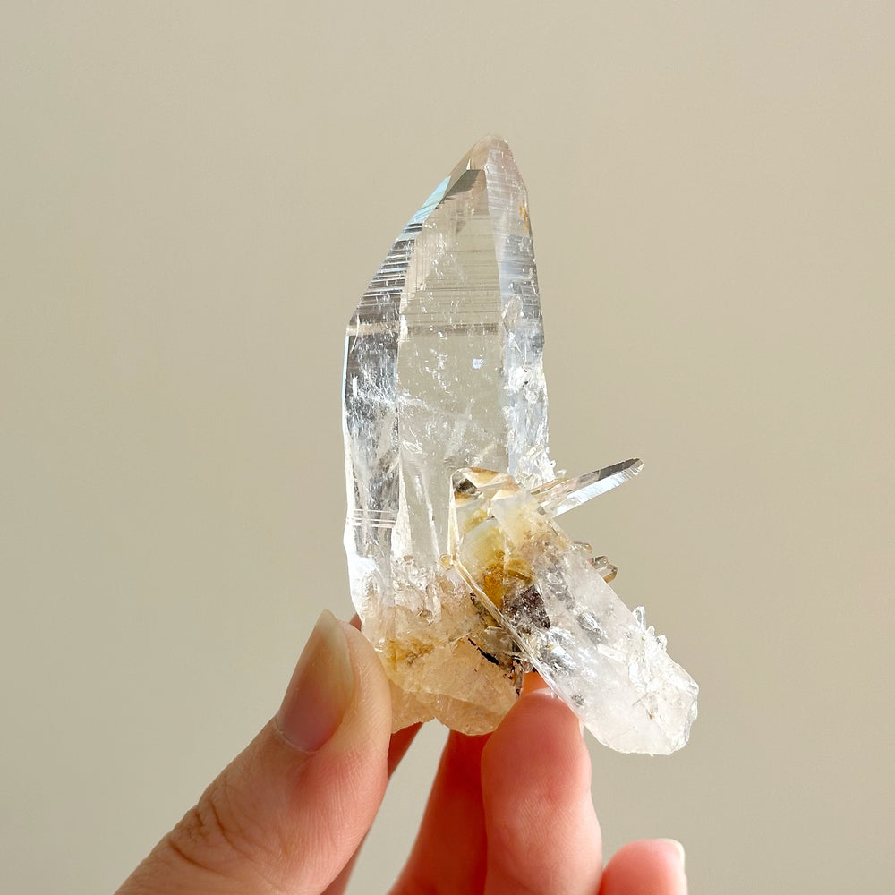 **Note: You are purchasing the exact piece shown. A rare piece with smaller points grown on the main piece (barnacle formation). Water clear quality! This piece is left in its raw formation, no polishing done, direct from nature. Therefore, there may be nicks, flaws and or pockets that are not fully captured. Please go through all photos before purchase.